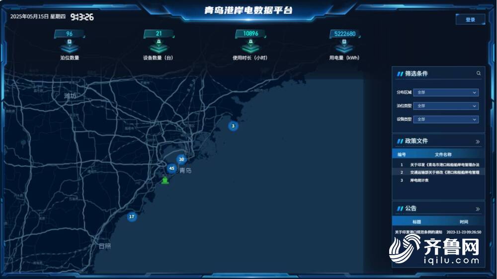青岛港岸电数据渠道旨在经过智能化监测与数据剖析,破解传统港口污染防治中信息涣散、监管低效的难题,为绿色港口建造供给体系性解决方案。渠道已研制掩盖96个泊位的岸电设备实时监测。经过三级功用架构(岸电建造、运用、数据展现),完成泊位数量、设备状况、用电时长及能耗等根底信息的“一张图”可视化出现。体系具有数据实时收集、动态剖析、全景感知才能,支撑多维度计算与智能预警,为职业管理供给科学决策依据。